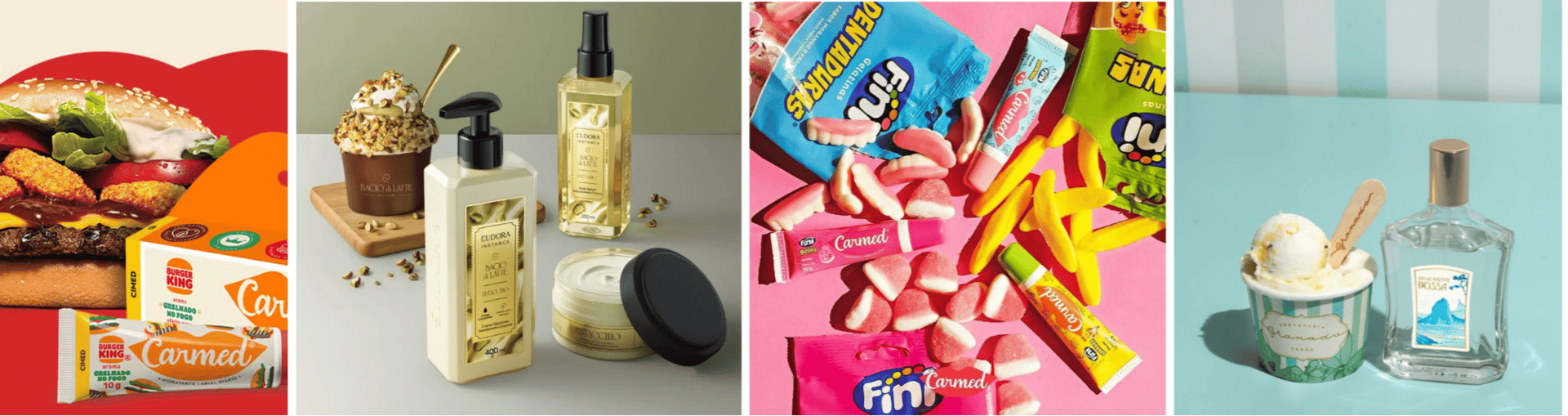 Dessa forma, as marcas de tecnologia, moda, beleza, luxo e estilo de vida conseguem mexer com as nossas emoções em um nível mais profundo, tornando seus produtos aparentemente mais acessíveis, desejáveis e emocionalmente envolventes. 🧠 As collabs da Carmed são um exemplo claro da tentativa de explorar todas as nossas sensações: os hidratantes labiais em parceria com a Fini, a Coca-Cola e o Burger King, que possuem aromas e sabores específicos. 👅 Podemos lembrar também do lançamento de produtos corporais Eudora com fragrâncias de gelato Bacio di Latte (Vanilla Caramel, Pistacchio…), da sorveteria Granado e de tantos outros exemplos.
